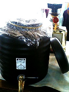 画像は、水わりを蓄えていた焼酎サーバーです。これを片付ける際に蓋のラップについている水滴をひとなめしてみました。蒸発した焼酎の香りがまろやかさとふくよかさを出し、甘みが感じられ驚きました。染色と同様で、このテのものは分子の結合の領域です。他の焼酎も楽しみであります。